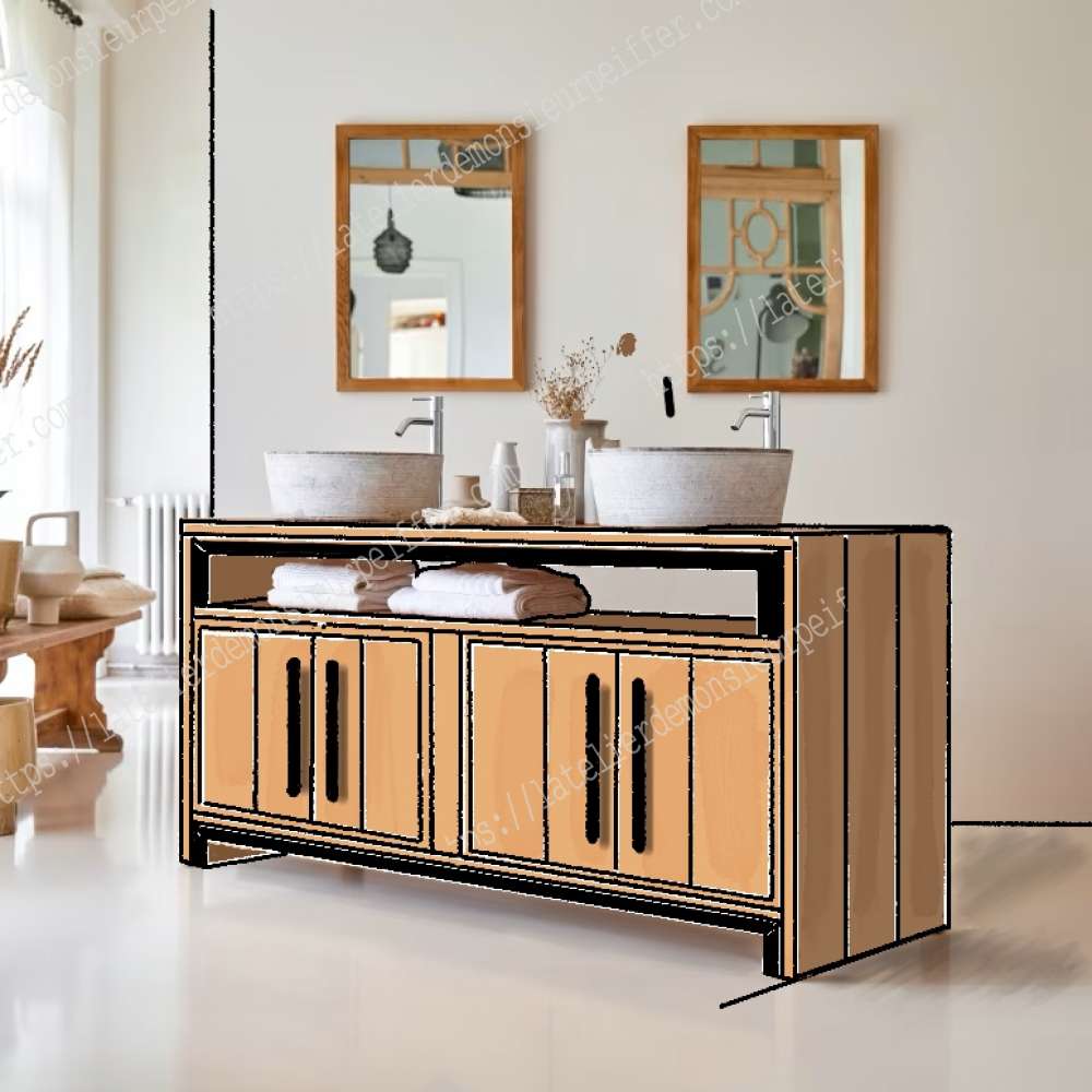 Pour votre salle de bain voici un meuble sous vasque bois massif sur mesure et sur commande. Longueur: 170 cm ou 225 cm Profondeur: 50 cm Hauteur: 80 cm 🏷Prix : 1190€ (quelque soit la dimension/finition nature) 🖌️Finition nature: Gratuit 🖌️Finition blanche, or, noir: 30€ 👌Vitrification mat : 120€ 🚚Livraison Nord-pas-de-Calais par l'atelier: 90€ 🚚Livraison 🇫🇷 🇧🇪 🇱🇺 🇮🇹 🇨🇭 🇲🇨 par transporteur avec 2 livreurs: 250€ 🚚Livraison 🇩🇪 🇪🇸 🇵🇹par transporteur avec 2 livreurs: 370€ Rendez-vous pour une visite du showroom à Houplin-Ancoisne 59263 7jrs/7 📞07.82.14.30.86 ou ouverture publique le premier dimanche de chaque mois de 14h à 17h toute l'année