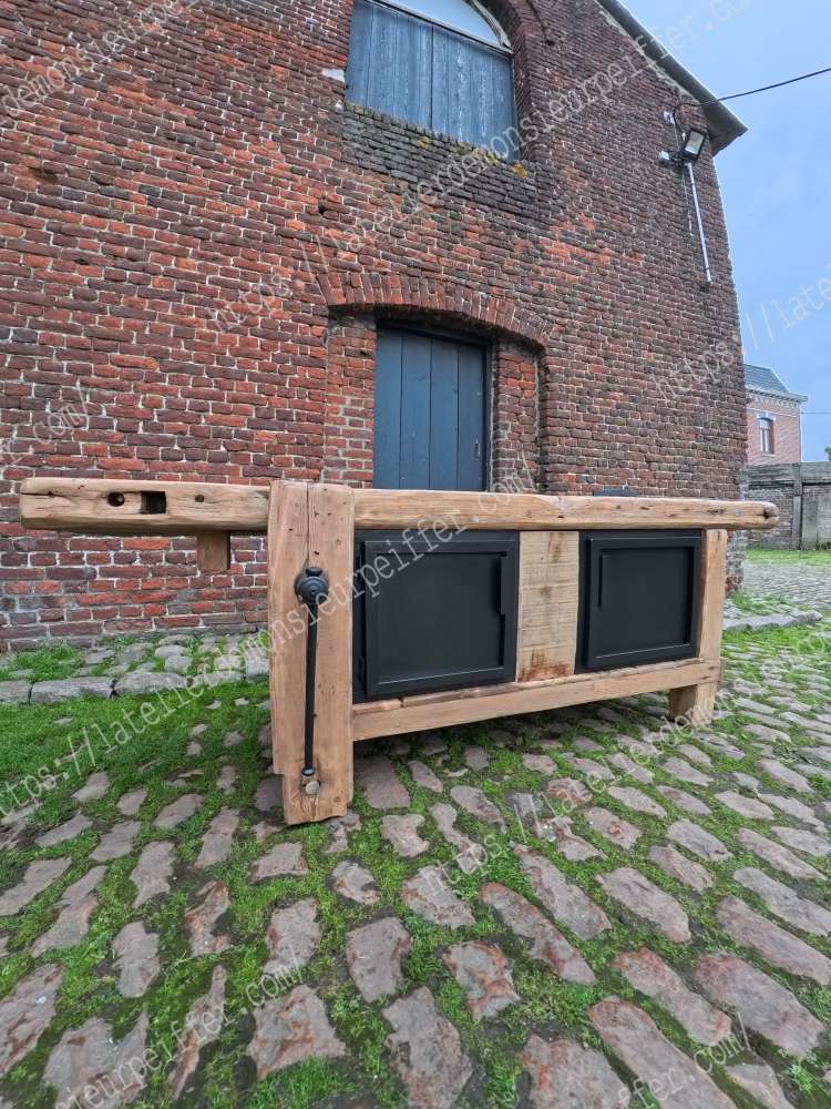 Ancien établi de menuisier. Dimensions: L212cm/P44cm/h77cm Tarif: 1790€ Livraison inclus dans le 59/62.